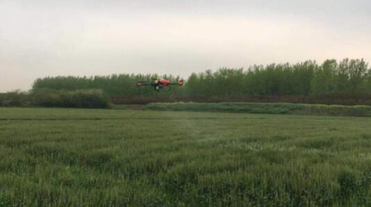 4月13日,在半店社區的市級示范家庭農場林峰家庭農場植保無人機正在噴灑防控防治小麥赤霉病的高效低污染農藥。農場負責人楊明忠介紹:“2天下來噴灑了近2000多畝,在鎮農村工作中心和社區的指導下,完成了整個社區第一次赤霉病的防控防治面積,趁著天晴氣好,5天后將再進行第二次噴灑農藥,加強防治和控制的效果?!?/p>