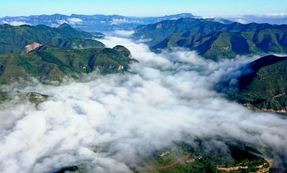 當日,位于太行山深處的河北省邢臺市天河山景區出現云海景觀,云霧在綠意盎然的峰林間飄蕩,山巒與云海交相輝映,美若畫卷。