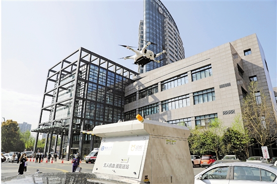 3月24日8時55分,一架載有急救用血的無人機徐徐降落在浙大二院濱江院區專用停機坪。