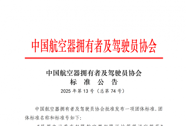 中國航空器擁有者及駕駛員協會批準發布一項團體標準。團體標準名稱和標準號如下:《民用電動垂直起降航空器起降場地等級評定規范》(T/AOPA0088—2025)以上標準于2025年08月20日起實施。予以公告。中國航空器擁有者 ...
